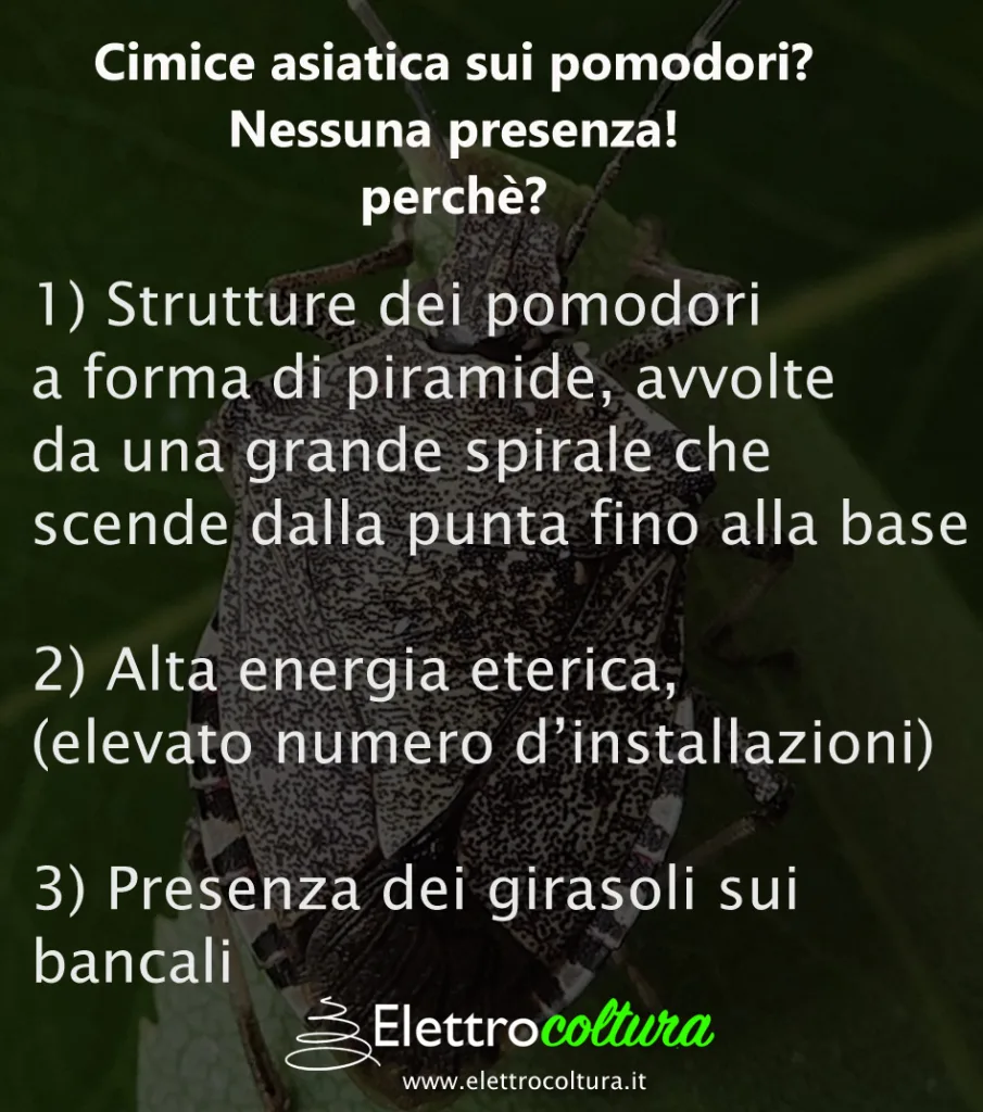 Negli ultimi 3 anni nel periodo di Luglio e Agosto quando i pomodori sviluppano, la presenza della cimice asiatica si è fatta sentire prepotentemente, in questo anno dopo 12 mesi di elettrocoltura intensiva, le poche cimici asiatiche che ho visto sono solo sopra i girasoli giganti, che sono oltretutto giunti quasi alla fine del loro ciclo di vita. Nessun pomodoro è stato punzecchiato e questa è realmente una grande vittoria. Ma quali sono i fattori che hanno portato questo risultato?
