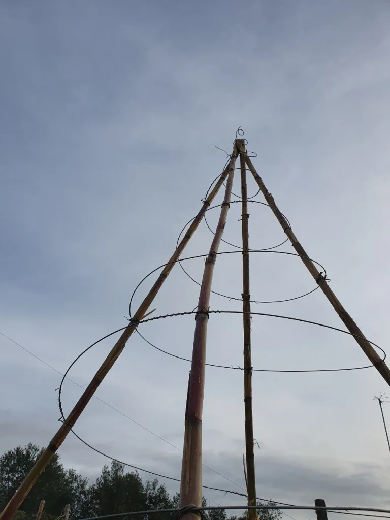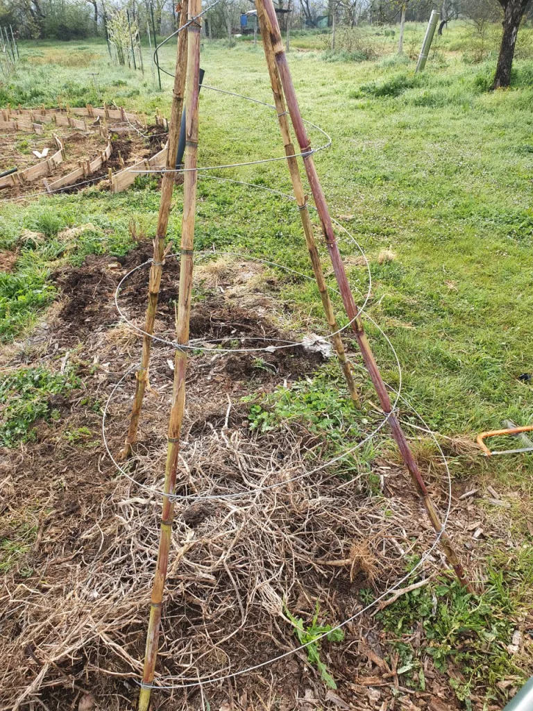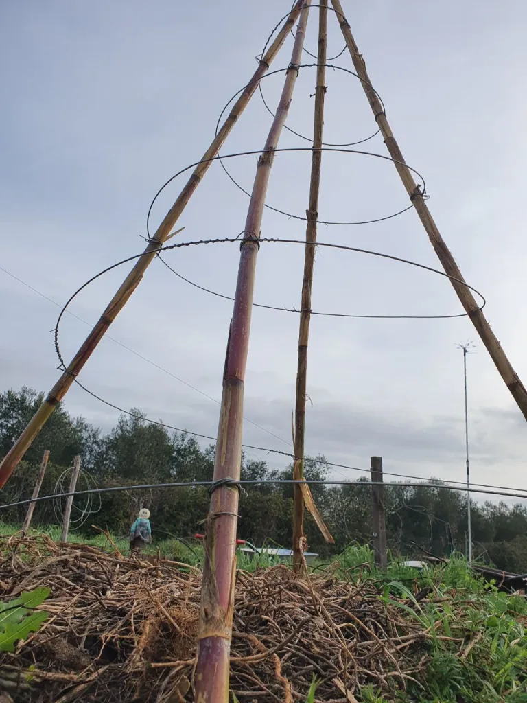 Questa mattina di buon mattino, mi sono dedicato alla costruzione della grande spirale armonica di 90 mq, tra una pausa e l’altra, osservando la piramide fatta con canne di fiume, posizionata sopra le patate in via sperimentale, ho immaginato una grande spirale che l’avvolgeva, in un batti baleno ho preso del filo zincato con spessore 3,5 mm, ho rivestito le 4 diagonali alte 180 cm, fino alla punta.